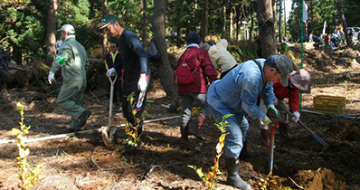 鳥海山にブナを植える活動に毎年参加し植樹活動のお手伝いをしています。植樹活動が終わった後には地元の食材を使った鍋(なべっこ)で参加者全員と交流を図っています。