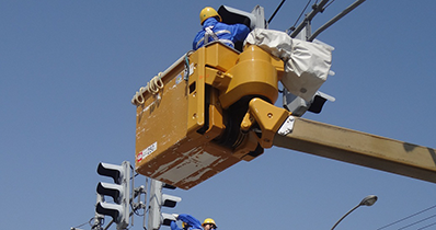 青森電力センターでは、外ヶ浜警察署および地元の電気工事店の方々と協力し、毎年春に外ヶ浜警察署管内の交通信号機の清掃活動を行っています。この活動は高所作業車を活用して実施しており、分社前から30年以上継続して行っています。