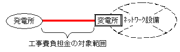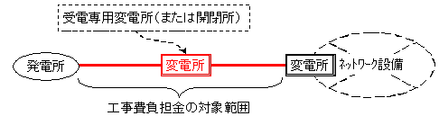 発電所から最初の当社変電所または開閉所までの間の当社供給設備で、発電所の連系にともなって工事が必要となる部分が工事費負担金の対象となります。 なお、発電所への事故波及防止のために専用の変電所・開閉所を施設する場合には、専用ではない変電所・開閉所までの供給設備が対象となります。