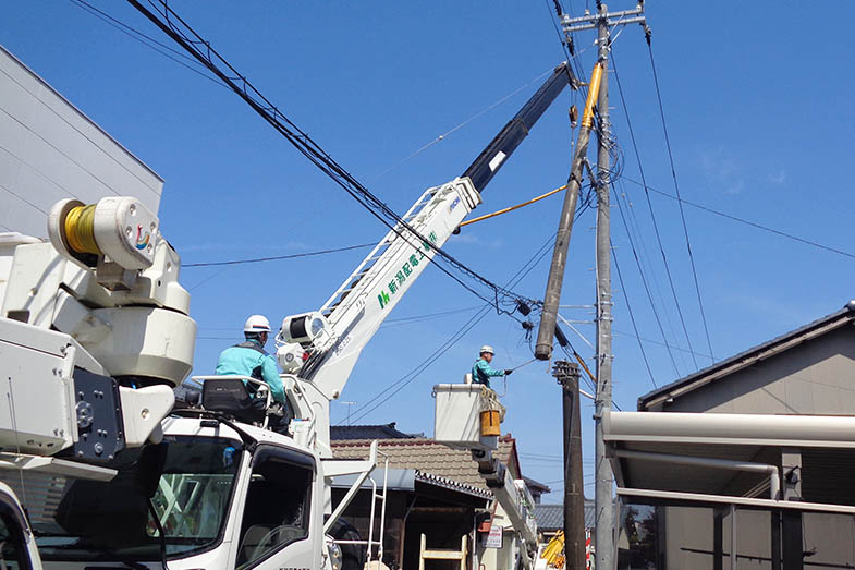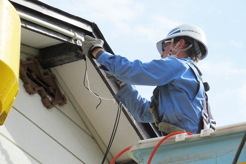 電柱に取り付けられている電線と建物をつなぎ、各家庭などへ電気を届ける引込線にかかわる仕事をします。引込線を取り付ける、古くなった引込線を取り替えるなどの工事を行います。