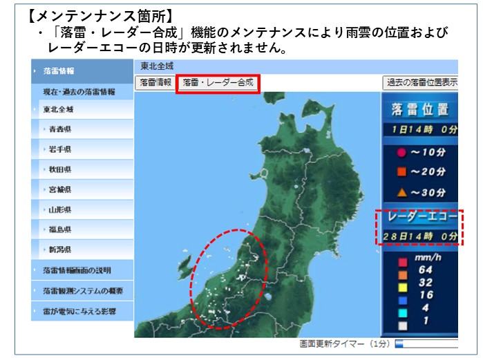 メンテナンス期間中は、「落雷・レーダー合成」機能をご利用いただけませんので、ご理解のほどよろしくお願いいたします。