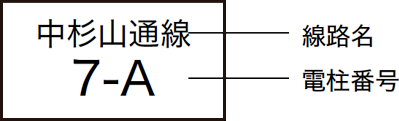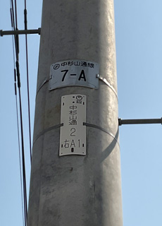 電柱番号を記載した札には、当社用(電力用)とNTT さま用があります。当社用の電柱札は銀地に黒字の横長タイプで、写真の場合「中杉山通線7-A」です。