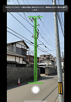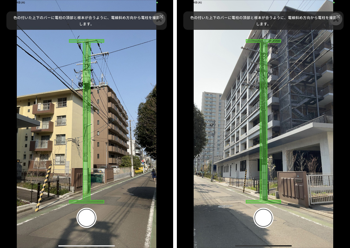 色の付いた上下のバーに電柱の頂部と根本が合うように、電線斜め方向から電柱を撮影します。