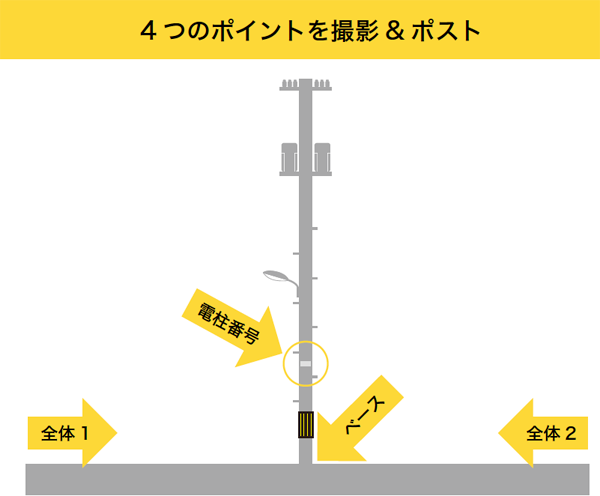 - グレーの電柱を見つけたら、「全体写真」2 枚と「ベース写真」「電柱番号写真」を撮影、投稿します。